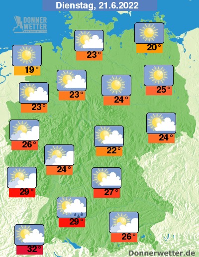 Am Dienstag ist es oft heiter oder sonnig, gebietsweise ziehen jedoch auch einige Wolken durch, dabei bleibt es weitgehend trocken. Die Temperatur steigt auf 19 Grad an der Nordsee und bis zu 32 Grad im Oberrheingraben.
