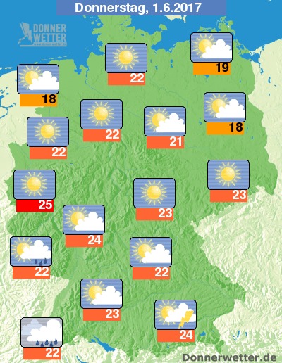 Der Donnerstag zeigt sich über der Republik verbreitet heiter oder sonnig und dabei trocken. Vor allem an den Alpen, aber auch im Südwesten ziehen jedoch oft dichte Wolken auf und es bilden sich einzelne Schauer oder Gewitter. Die Temperatur steigt auf 18 Grad an der Nordseeküste und bis 25 Grad in der Kölner Bucht.