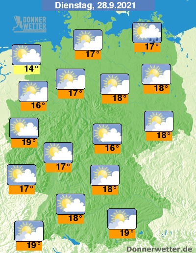 Am Dienstag bleibt es über der Südosthälfte meist stark bewölkt, sonst ist es teils stark, teils wechselnd bewölkt. Über Bayern und Sachsen bilden sich anfangs noch einzelne Schauer, sonst bleibt es im Land weitgehend trocken. Die Temperatur steigt auf 14 Grad an der Nordsee und bis 19 Grad in Berchtesgaden.