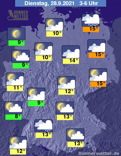 In der kommenden Nacht bleibt es vor allem im Osten und Nordosten meist stark bewölkt und hier bilden sich einzelne Schauer, auch im Südwesten sind einzelne Schauer möglich. Im übrigen Land ist es teils stark, häufig aber auch wechselnd bis aufgelockert bewölkt, dazu bleibt es weitgehend trocken. Die Temperatur sinkt auf 15 Grad in Dresden und bis 8 Grad in Saarbrücken.