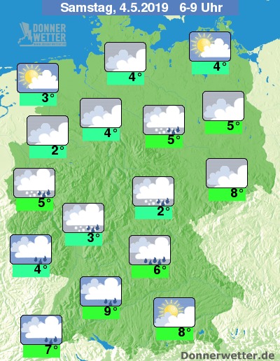 Der Samstag beginnt an den Küsten sowie am Alpenrand mit einem Mix aus Sonne und Wolken, in den übrigen Landesteilen bleibt der Himmel überwiegend bedeckt. Regen-, in höheren Lagen auch Schneeregenschauer sind in den Frühstunden vor allem in der West- und Südwesthälfte sowie der Landesmitte zu erwarten.