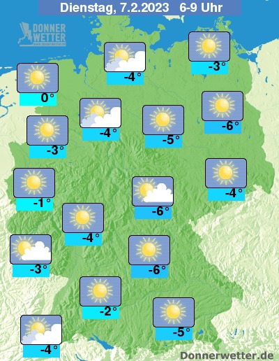 Die Temperaturen liegen in den Morgenstunden bei Werten um -6 Grad in Erfurt und 0 Grad in Ostfriesland.