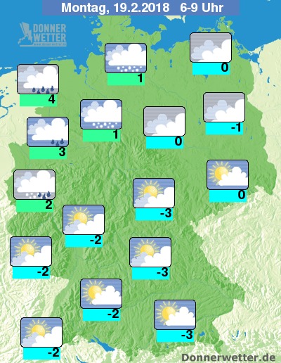 Grau und nasskalt startet die neue Arbeitswoche dann vor allem in der Nordwesthälfte. Regional muss mit Glätte und Beeinträchtigungen im Berufsverkehr gerechnet werden. Freundlicher startet am Montagmorgen der Süden in den Tag, hier bleibt es bei wechselnder Bewölkung meist trocken.