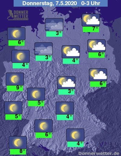 In der Nacht präsentiert sich der Himmel im Großteil unseres Landes sternenklar. Nur über den Nordosten ziehen einige Wolkenfelder hinweg, die an der Ostsee auch mal dichter werden können. Desweiteren kann sich über dem Norddeutschen Tiefland stellenweise Nebel bilden.