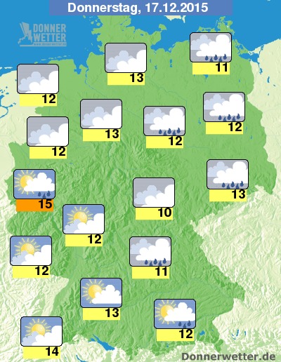 Heute ist es zunächst im Norden, im Osten und im Südosten Deutschlands dicht bewölkt bei zeitweiligem Regen oder Sprühregen. Weiter nach Südwesten hin kann sich zwischen den Wolken zunehmend auch mal die Sonne zeigen und es bleibt schon weitgehend trocken. Im Tagesverlauf klingt der Regen auch in den nördlichen und östlichen Landesteilen ab, zumeist bleibt es hier jedoch stark bewölkt, sonst ist es zumeist aufgelockert, gebietsweise aber auch stark bewölkt, dazu jedoch trocken. Die Temperatur steigt auf 10 Grad in Oberfranken und bis auf sehr milde 15 Grad in der Kölner Bucht.