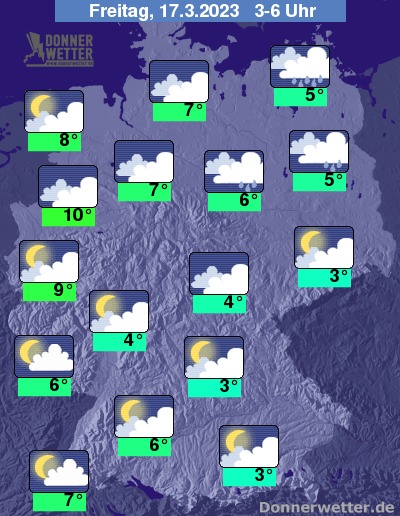 In der folgenden Nacht fällt nach Nordosten hin zunächst noch zeitweise Regen, der gegen Morgen jedoch abklingt. Im übrigen Land ist es verbreitet stark oder dicht bewölkt. Größere Auflockerungen sind vor allem im Südwesten möglich. Die Temperatur sinkt auf 10 Grad in Münster und bis 3 Grad in Nürnberg.