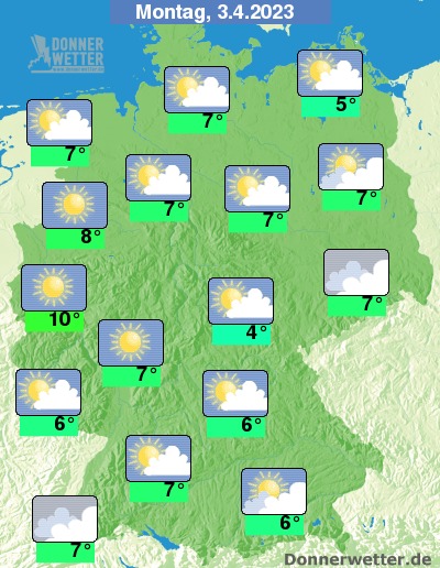 Am Montag halten sich am Alpenrand noch oft dichte Wolken und es können sich noch vereinzelt Schneeschauer bilden. Im übrigen Land ist es dagegen überwiegend heiter bis sonnig, teilweise ziehen auch einige Wolken durch, dabei bleibt es aber trocken. Die Temperatur steigt auf 4 Grad in Jena und bis 10 Grad in Köln.
