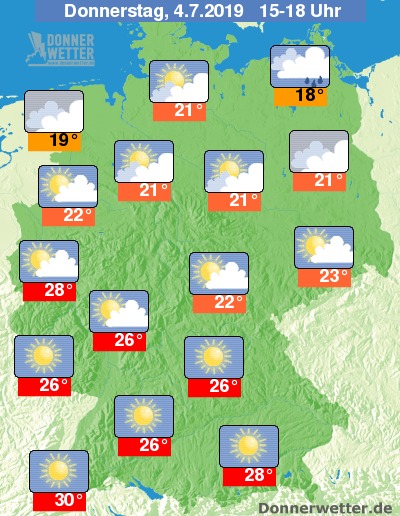 Die Temperaturen bewegen sich im Norden und Osten zwischen 17 und 23 Grad, im Süden und Westen werden meist sommerliche 24 bis 28 Grad erwartet.