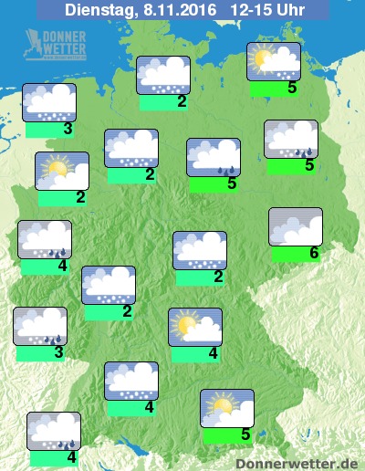 Heute Nachmittag halten sich über dem Land überwiegend dichte Wolken, einzelne Auflockerungen sind vor allem im Nordosten und Süden möglich. Es fällt jedoch verbreitet Regen, Schneeregen und selbst bis in die Niederungen auch Schnee. Dabei besteht Glättegefahr! Die Temperatur liegt bei unterkühlten 2 bis 6 Grad.