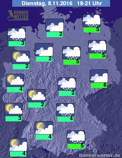 Heute Abend bleibt die Wolkendecke über der Osthälfte verschlossen und es fällt immer wieder Regen, Schneeregen oder Schnee mit einhergehender Glättegefahr! In den westlicheren Landesteilen ist es hingegen meist aufgelockert oder locker bewölkt und dazu weitgehend trocken. Die Temperatur liegt bei sehr kühlen 2 bis 6 Grad.