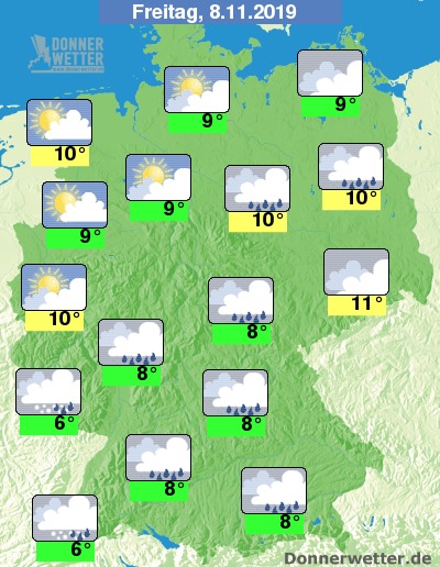 Im Süden halten sich kompakte Wolken aus denen es gebietsweise regnet, in den südwestlichen Mittelgebirgen und im Alpenvorland kann die Schneefallgrenze auch mal unter 600 m sinken. Im Tagesverlauf zieht der Regen über die Landesmitte und erreicht gegen Abend auch Teile Sachsen-Anhalts und Brandenburgs. Im Nordwesten gibt es längere freundliche und trockene Abschnitte.