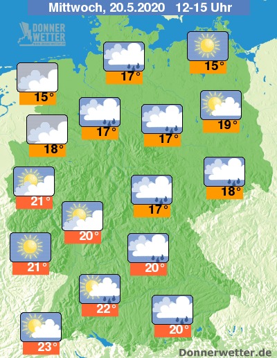 Am frühen Nachmittag gibt es sowohl im Nordosten, als auch im Südwesten eine freundliche und trockene Zone mit einer Mischung aus Sonne und Wolken, teilweise scheint die Sonne auch für längere Zeit. Dazwischen überwiegen die Wolken und bringen regional einige Regenfälle oder Schauer.