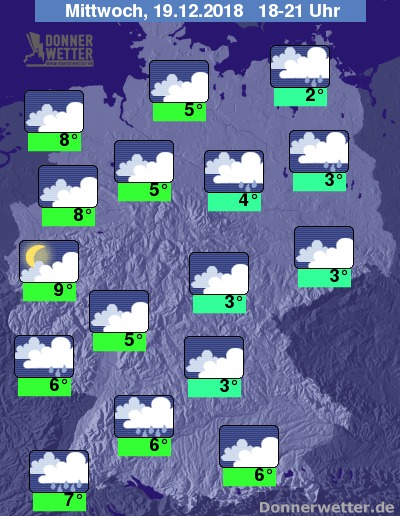 Am Abend bleibt es meist dicht bewölkt, nur im Westen zeigen sich manchmal Mond und ein paar Sterne. Vor allem im Südwesten und Nordosten kann es tröpfeln.