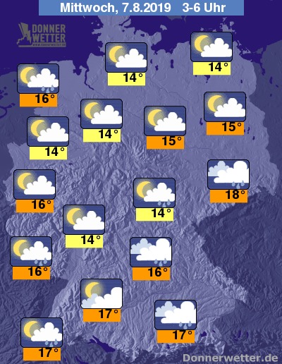 Die Temperaturen liegen am frühen Abend im Norden und in der Mitte zwischen 21 und 25 Grad, im Süden und Osten können vor Regengüssen noch sehr warme bis heiße 26 bis 31 Grad erreicht werden.