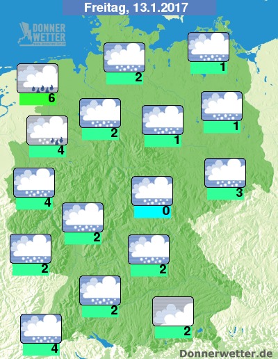 Die Höchstwerte liegen am Tag zwischen 0 Grad im Thüringer Bergland und 6 Grad an der Nordsee.