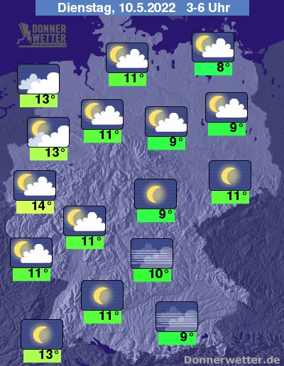 In der Nacht zum Dienstag bleibt es über der Südosthälfte des Landes verbreitet sternenklar. Im übrigen Land ziehen aus Nordwesten mehr und mehr und im Nordwesten dann auch dichte Wolken auf, dazu bleibt es aber trocken. Die Temperatur sinkt auf 14 Grad in Bonn und 8 Grad in Neubrandenburg.