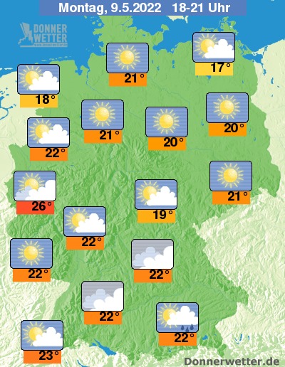 Heute Abend ist es vor allem über der Nordhälfte Deutschlands überwiegend sonnig und sonst ziehen hier nur wenige Wolken durch. Im Alpenvorland können sich teils dichte Wolken und einzelne Schauer, örtlich auch Gewitter bilden, im übrigen Land ist es größtenteils heiter bis sonnig, hier und da sind mehr Wolken möglich, dabei bleibt es trocken. Die Temperatur liegt bei 17 Grad in Rostock und 26 Grad in Köln.