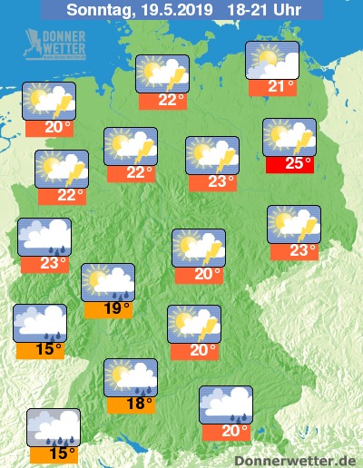 Heute Abend lockert es hier und da auf, häufig ziehen aber auch dichte Wolken durch, die vielerorts für Schauer und lokale Gewitter sorgen. Die Temperatur liegt bei 15 Grad in der Pfalz und bis 25 Grad in Berlin.