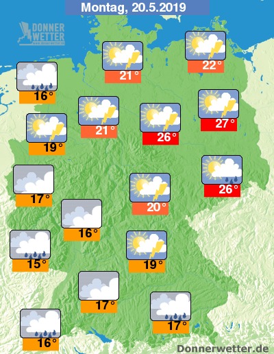Am Montag ziehen of dichte Wolken durch, zum Teil zeigen sich aber auch Auflockerungen. Es können sich wiederholt Schauer und örtliche Gewitter bilden. Die Temperatur erreicht 15 Grad im Südwesten und bis 27 Grad im Osten.