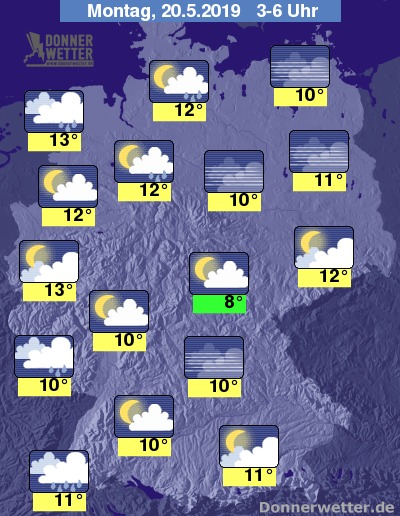 In der Nacht zum Montag klingen Schauer und Gewitter in weiten Landesteilen ab, besonders über dem Nordwesten und Südosten des Landes bilden sich aber bis zum Morgen hin gebietsweise Schauer und einzelne Gewitter, sonst ist es mehrheitlich trocken, Vom Nordosten, Osten bis in die Mitte des Landes ist es locker bewölkt oder sternenklar, sonst bleibt es meist bei der starken Bewölkung. Die Temperatur sinkt auf 13 Grad an der Nordsee und bis 8 Grad im Vogtland.