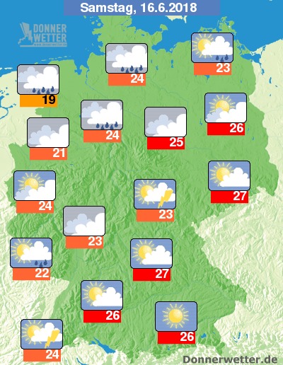 Am Samstag ist es im Süden und Osten meist heiter und trocken. Im übrigen Bundesgebiet ziehen im Tagesverlauf jedoch meist dichte Wolken durch, die hier und da Schauer und selten auch Gewitter bringen, sonst bleibt es weitgehend trocken. Die Temperatur erreicht 19 Grad an der Nordsee und bis 27 Grad in der Lausitz.