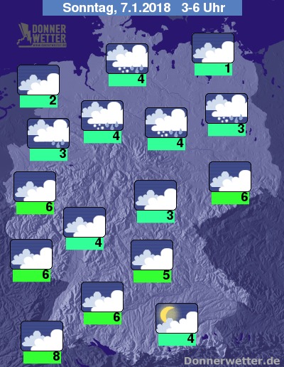 In der Nacht zum Sonntag verdichten sich die Wolken auch im Süden, dazu bleibt es aber trocken. Im übrigen Land bleibt es weiterhin bedeckt und es fällt gebietsweise Regen, gegen Morgen im Norden teils auch Schneeregen oder Schnee, dazu besteht stellenweise Glättegefahr! Die Temperatur sinkt auf 8 Grad im Breisgau und bis 1 Grad in Vorpommern.