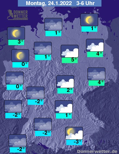 In der Nacht zum Montag zeigt sich der Himmel über der Westhälfte Deutschlands und über dem Nordosten verbreitet sternenklar, stellenweise bildet sich Nebel. Im übrigen Land bleibt es hingegen größtenteils bedeckt und teils wird es neblig-trüb, dazu bleibt es weitgehend trocken. Die Temperatur sinkt auf 5 Grad in Magdeburg und bis -3 Grad in Augsburg.