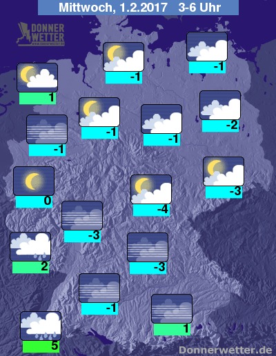 In der bevorstehenden Nacht ist es am Alpenrand noch meist bedeckt und es fällt hier gebietsweise Regen, zum Teil auch Schneeregen, dabei ist mit möglicher Glätte zu rechnen! Weiter nach Norden hin ist es häufig locker oder aufgelockert bewölkt, nicht selten auch sternenklar. Mehr und dichtere Wolken halten sich über dem Osten Deutschlands, jedoch bleibt es auch hier trocken. Die Temperatur sinkt auf 5 Grad in Freiburg und bis -4 Grad im Grabfeld.