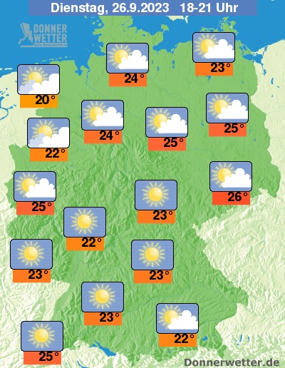 Heute Abend ist es verbreitet sonnig oder nur locker bewölkt. Mehr Wolken sind in Nordseenähe und auch im übrigen Nordwesten Deutschlands möglich. Es bleibt landesweit trocken bei Werten von 20 Grad in Bremerhaven und 26 Grad in Dresden.