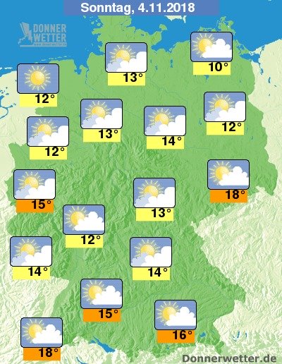 Am Sonntag ist es nach Auflösung örtlicher Nebelfelder zumeist heiter oder sonnig, hier und da bleibt es aber auch neblig-trüb oder stark bewölkt, jedoch bleibt es überall trocken. Die Temperatur erreicht 10 Grad in Stralsund und bis 18 Grad in Freiburg.