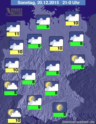 Heute Abend zeigt sich der Himmel über dem Südosten noch weitgehend sternenklar, sonst zieht sich es sich jedoch verbreitet zu und gegen Mitternacht ist es nur im Süden und in Sachen noch oft aufgelockert oder locker bewölkt. Im Westen und Norden kommt stattdessen auch gebietsweise leichter Regen auf. Die Abendtemperatur liegt bei 11 Grad an der Ems und um 8 Grad in Unterfranken. An der Nordsee weht starker bis stürmischer Wind.