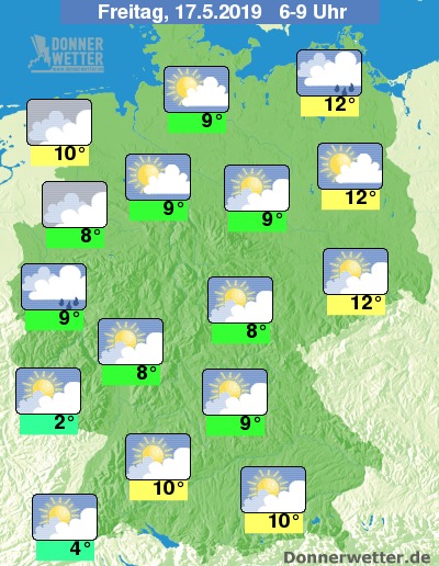 Am Freitagmorgen hällt sich die Sonne hinter meist aufgelockerten oder stark bewölkten Wolken versteckt. Niederschläge sind bei der Ostseeküste und der Eifel zu erwarten, sonst bleibt es trocken. Die Sonne zeigt sich im Tagesverlauf dann vermehrt. Die Temperaturen liegen am Morgen bei 12 Grad C um Berlin und 2 Grad um das Saarland.