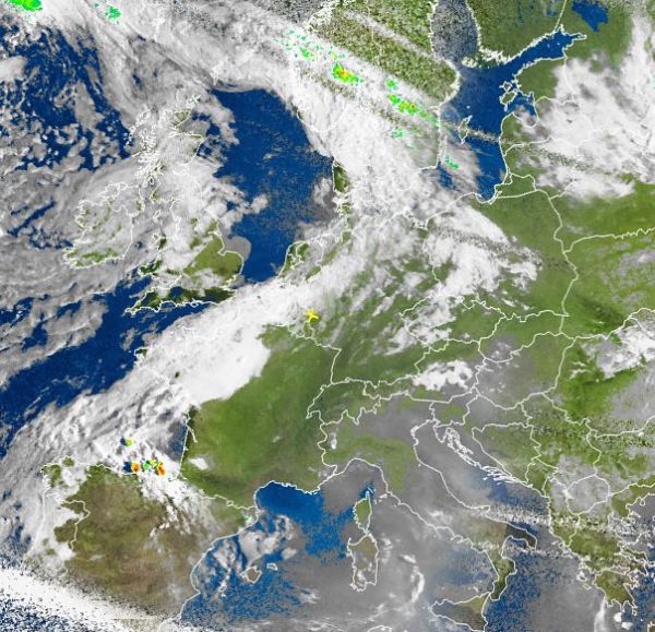 Auf dem Satellitenfoto von heute Morgen ist ein breites Wolkenband zu erkennen, das sich von der Biskaya, über die Nordwesthälfte Frankreichs, Benelux, Deutschland bis weit nach Skandinavien hinein erstreckt. In den Regionen bilden sich meist einzelne Schauer, häufig bleibt es aber auch trocken.