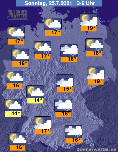 In der folgenden Nacht ist der Himmel über den westlichen Landesteilen meist gering bewölkt oder sternenklar und dazu bleibt es hier trocken. Im übrigen Bundesgebiet ist es häufig stark, teils aufgelockert bewölkt, dabei können sich besonders im Süden, aber auch sonst einzelne Schauer und vereinzelt auch Gewitter bilden. Die Temperatur sinkt auf 19 Grad in Dresden und bis 14 Grad in Saarbrücken.