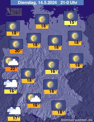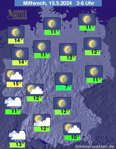 Die Temperaturen gehen in den Frühstunden zurück auf Werte um 15 Grad im Rheinland und 7 Grad in Erfurt.