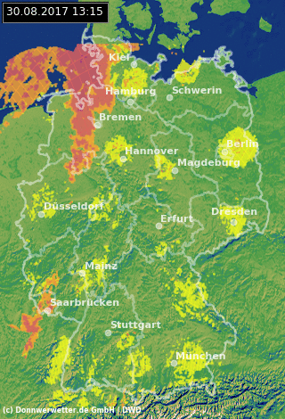 Am Nachmittag setzen sich Schauer und Gewitter im Norden und Nordwesten des Landes fort - der potentielle Unwetterschwerpunkt liegt dabei über Teilen Niedersachsens und Schleswig-Holsteins. Ein kleinere Front zieht zudem über das Saarland und Rheinland-Pfalz hinweg.