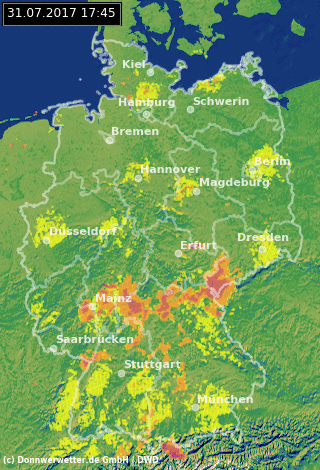 In der folgenden Nacht bleibt es über dem Sachsen sowie über dem Süden und Südosten des Landes weitgehend locker bewölkt und trocken. Über der übrigen Bundesrepublik zieht sich der Himmel hingegen verbreitet zu und es fällt auch gebietsweise, teils auch gewittriger Regen.
