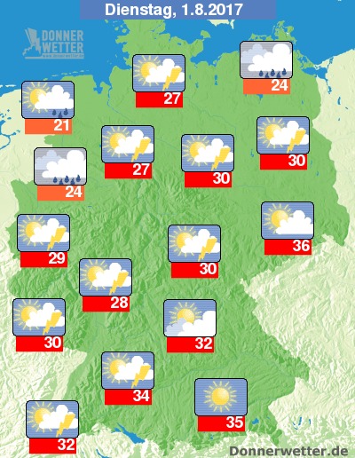 Am Dienstag erwartet uns über der Nordwesthälfte Deutschlands häufig starke, teils aber auch aufgelockerte Bewölkung, dazu bilden sich hier wiederholt Schauer und auch mögliche Gewitter. Der Süden und Osten des Landes zeigen sich zum Großteil heiter und trocken, im Tagesverlauf sind jedoch auch hier einzelne Schauer oder zum Teil auch kräftige Gewitter möglich. Die Temperatur steigt auf 21 Grad an der Nordsee und bis 36 Grad in Dresden.