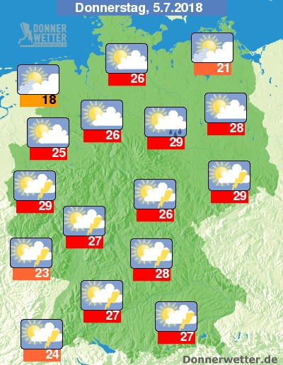 Die Temperaturen erreichen am Donnerstag moderate 18 bis 21 Grad C an den Küsten, um 29 Grad C im Rheinland sowie im südlichen Sachsen.