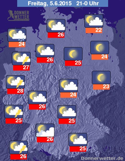 Die Temperaturen liegen am Abend bei Werten um 25 Grad C in Ostfriesland und um 32 Grad C im Rheinland.