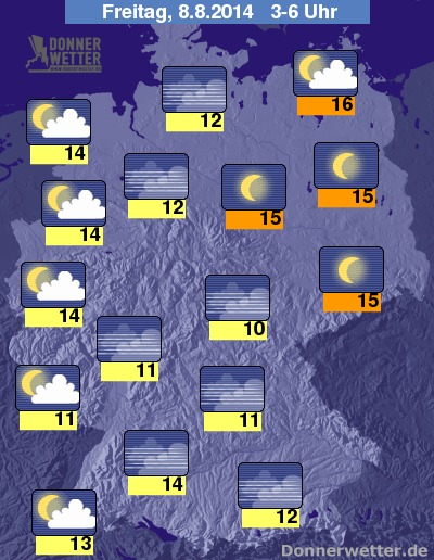 In der zweiten Nachthälfte klingen die Schauer und Gewitter auch im äußeren Osten und Süden ab und der Himmel kann sich auch hier häufig klar zeigen. Von Westen her ziehen zeitweise mehr Wolken durch, stellenweise bildet sich Nebel oder Hochnebel. Bei Tiefsttemperaturen zwischen 16 Grad an der Müritz und 10 Grad im Frankenwald bleibt es trocken.