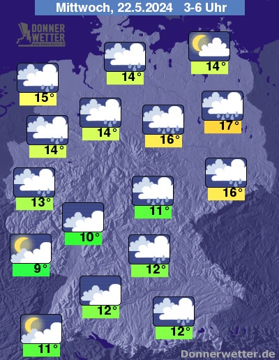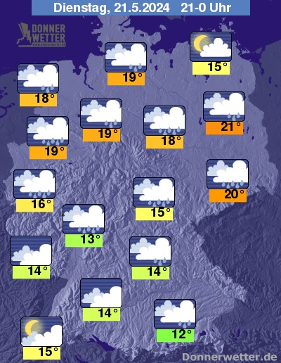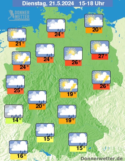 Am Nachmittag zeigt sich der Himmel über der Südhälfte stark bewölkt oder es ist bedeckt, dabei muss mit sich nach Norden ausbreitenden schauerartigen, teils auch gewittrigen Regen gerechnet werden. Vor allem vom Bayerischen Wald über Hessen bis nach NRW besteht lokal Unwettergefahr durch unwetterartige Gewitter und anhaltenden Regen! Im Norden und Nordosten bleibt es bei einem Mix aus Sonne und Wolken überwiegend trocken.