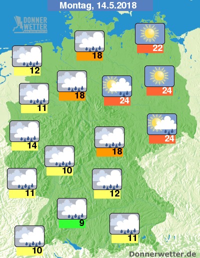 Der Montag zeigt sich über weite Landesteile verregnet und dicht bewölkt. Lediglich über dem Osten und Nordosten ist es heiter bis sonnig und dabei größtenteils trocken. Die Temperaur erreicht nur 9 Grad an der Schwäbischen Alb und bis 24 Grad in Berlin.