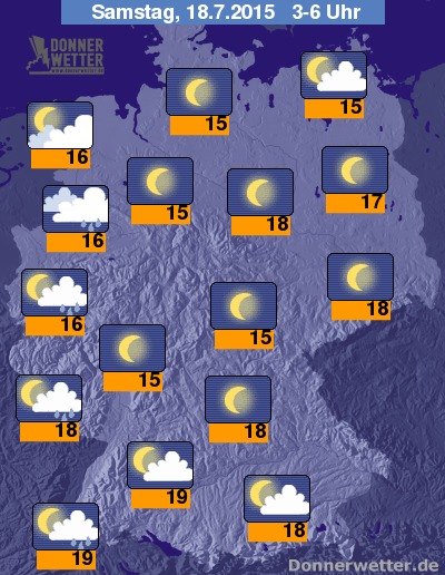 In der Nacht zum Samstag zeigt sich der Himmel vielerorts sternenklar, zunächst bilden sich aber im Süden und Osten, in der zweiten Nachthälfte dann eher im Westen und Norden gebietsweise Schauer und einzelne Gewitter, zumeist bleibt es jedoch trocken. Die Temperatur sinkt auf 19 Grad im Breisgau und bis 15 Grad am Westerwald.