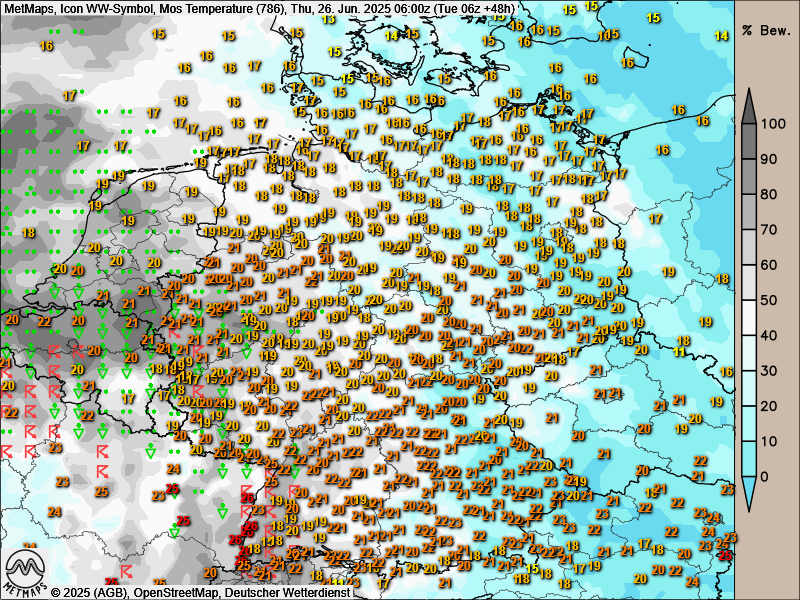 Die Wetterkarte mit Temperaturen für Donnerstagfrüh - im Westen und Südwesten sind bereits erste Schauer (grüne Symbole) und Gewitter (rote Symbole) unterwegs.