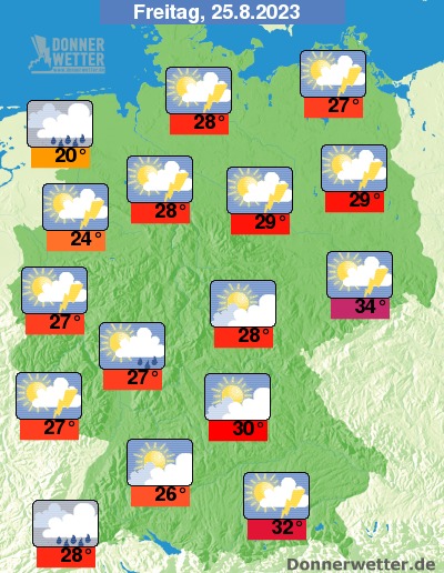 Die Temperaturen erreichen im Tagesverlauf nur noch Werte um 20 Grad an der Nordseeküste, 26 Grad in Schwaben. Nochmals schwül-heiße 34 Grad in Ostsachsen.