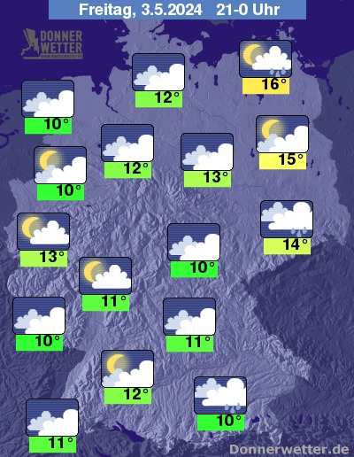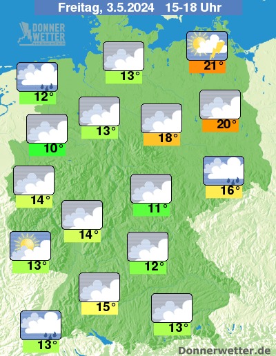 In den Nachmittagsstunden zeigt sich der Himmel über weiten Landesteilen wechselnd oder stark bewölkt. Von der Lausitz über Brandenburg bis nach Mecklenburg und Schleswig-Holstein sind dabei bei weiter zunehmender Quellbewölkung lokale Gewitter, teils auch mit Starkregen einhergehend, möglich. Teils auch mit Unwetterpotential. In den übrigen Landesteilen bleibt es weitgehend trocken.