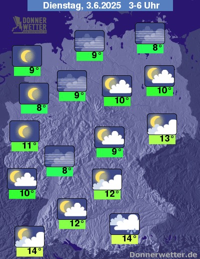 Die Temperaturen gehen in den frühen Morgenstunden zurück auf Werte um 14 bis 8 Grad.