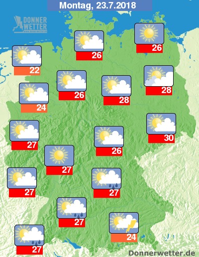 Heute ist es verbreitet heiter oder sonnig, lediglich im Alpenvorland bilden sich im Tagesverlauf gebietsweise Schauer und mögliche Gewitter, sonst bleibt es aber trocken. Die Temperatur steigt auf 22 Grad an der Nordsee und bis 30 Grad in der Lausitz.