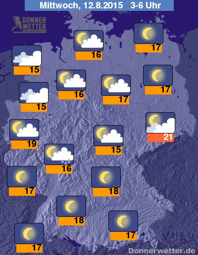 In der Nacht zum Mittwoch zeigt sich der Himmel über dem Süden Deutschlands weitgehend sternenklar, dabei bleibt es trocken. Weiter nach Norden hin ist es zumeist locker bis aufgelockert bewölkt, besonders nach Nordwesten hin aber auch verbreitet dicht bewölkt, dabei bleibt es ebenso trocken. Im Nordosten zeigt sich ein oft sternenklarer Himmel. Die Temperatur sinkt auf 21 Grad in Görlitz und bis 15 Grad im Eichsfeld.